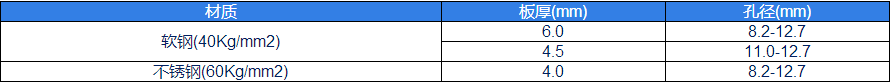 材质板厚(mm)孔径(mm)软钢(40Kg/mm2)6.08.2-12.74.511.0-12.7不锈钢(60Kg/mm2)4.08.2-12.7
